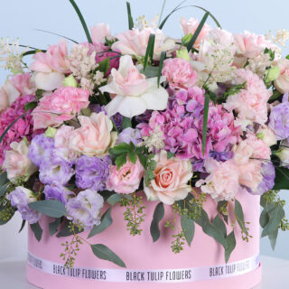 • A large round arrangement of pink and purple roses, hydrangeas, lisianthus, and greenery in a pink box, tied with a white ribbon.