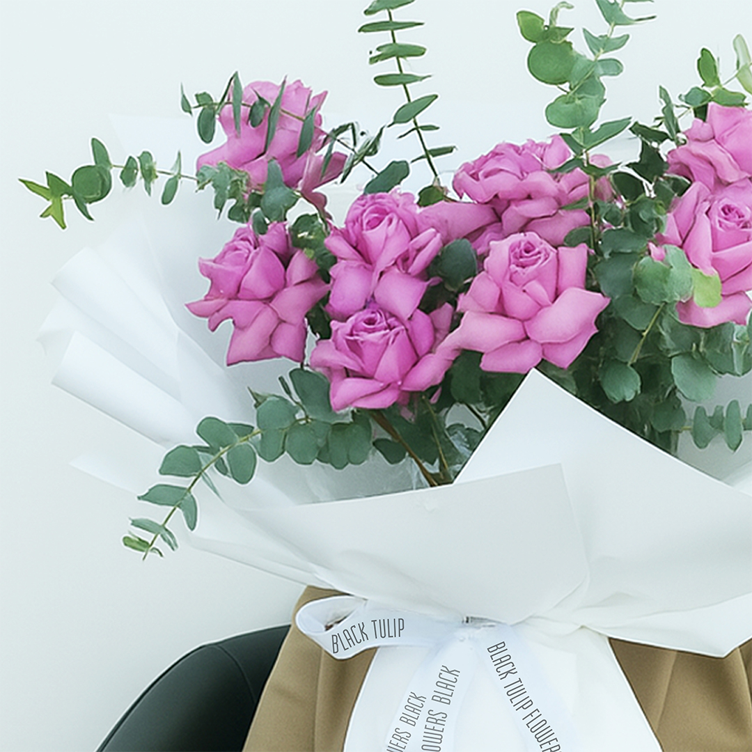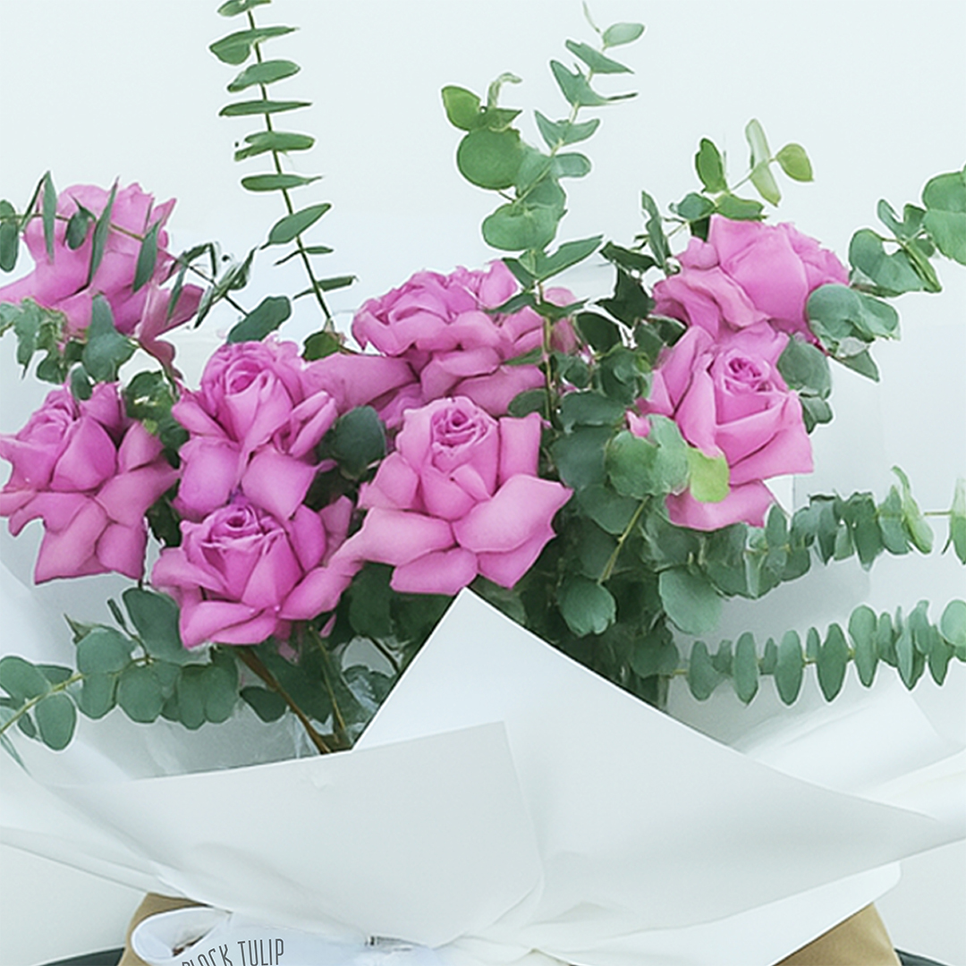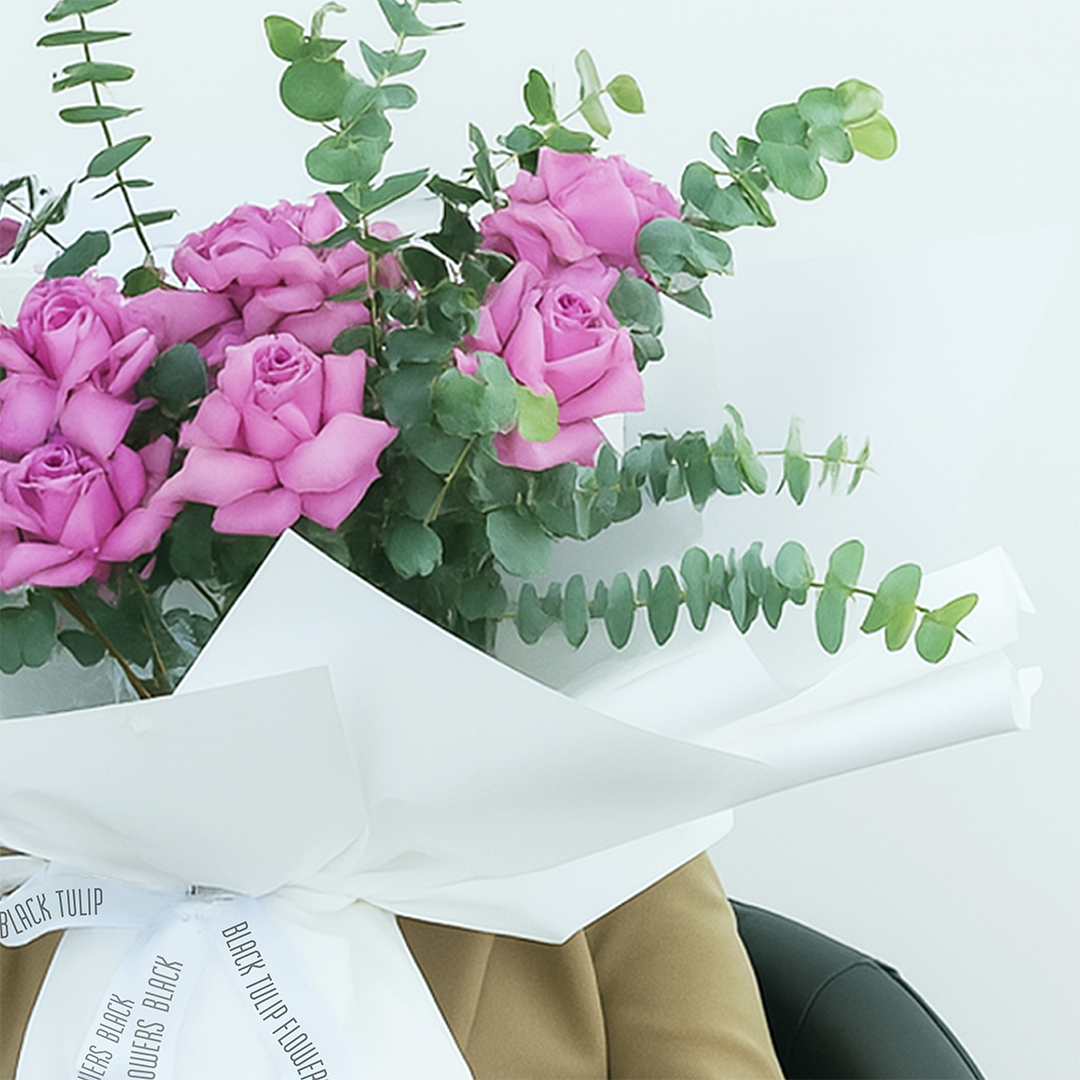 A stunning bouquet featuring beautiful purple roses complemented by fresh eucalyptus stems, perfect for expressing admiration, love, or appreciation.