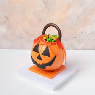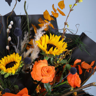 Brighten up your Halloween with this cheerful pumpkin flower arrangement! A vibrant blue pumpkin vase is filled with a sunny mix of sunflowers, pink roses, and autumnal foliage. This arrangement is sure to bring warmth and joy to any space.